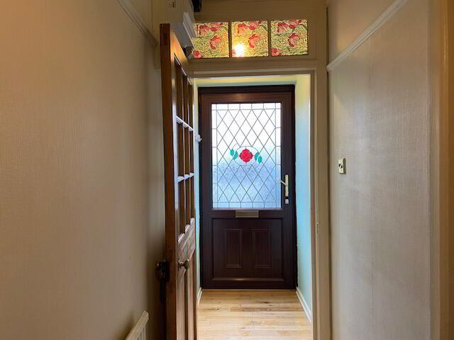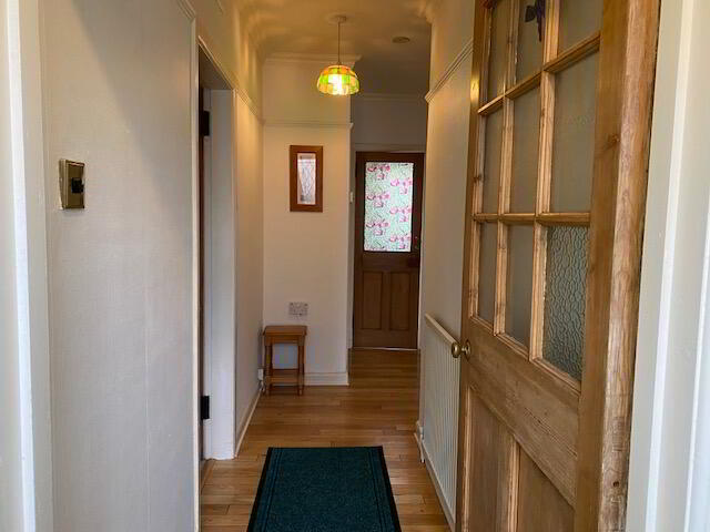 The hallway features solid wood flooring and decorative glass detailing.