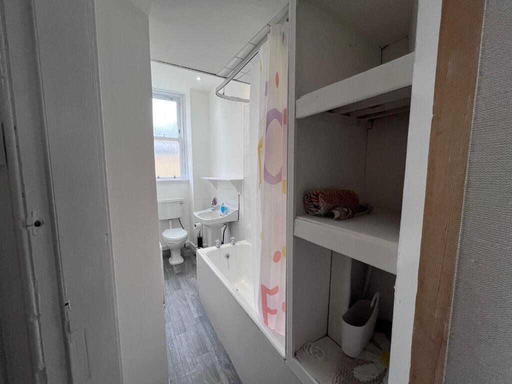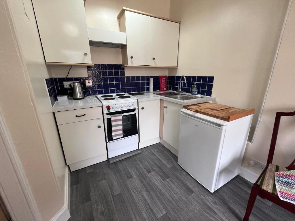 The well-equipped kitchen provides ample storage and workspace, suitable for everyday cooking and dining. The bathroom is bright and contemporary, featuring a shower over the bath for convenience.