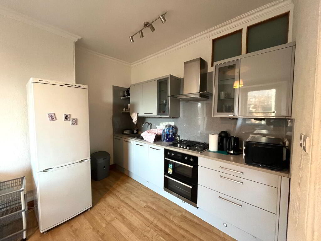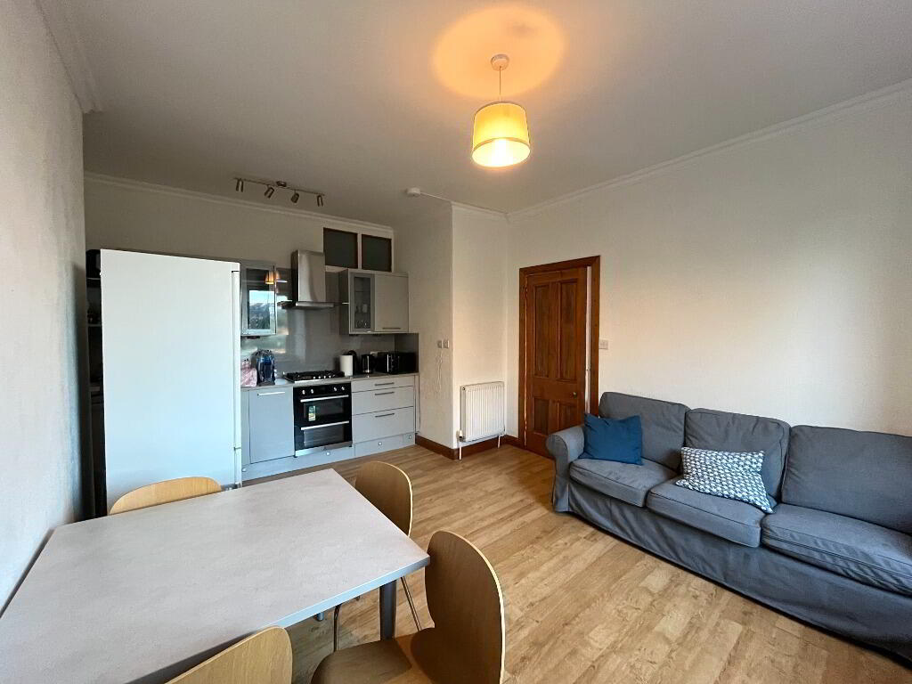 Property comprises of a bright and generously sized open-plan lounge and kitchen area. The kitchen is fully equipped with a fridge, freezer, gas hob, electric oven, microwave, toaster, kettle, and electric fan. There is ample storage space, along with a dining table and chairs. The lounge area features laminate flooring, three-seater sofa, and a coffee table.